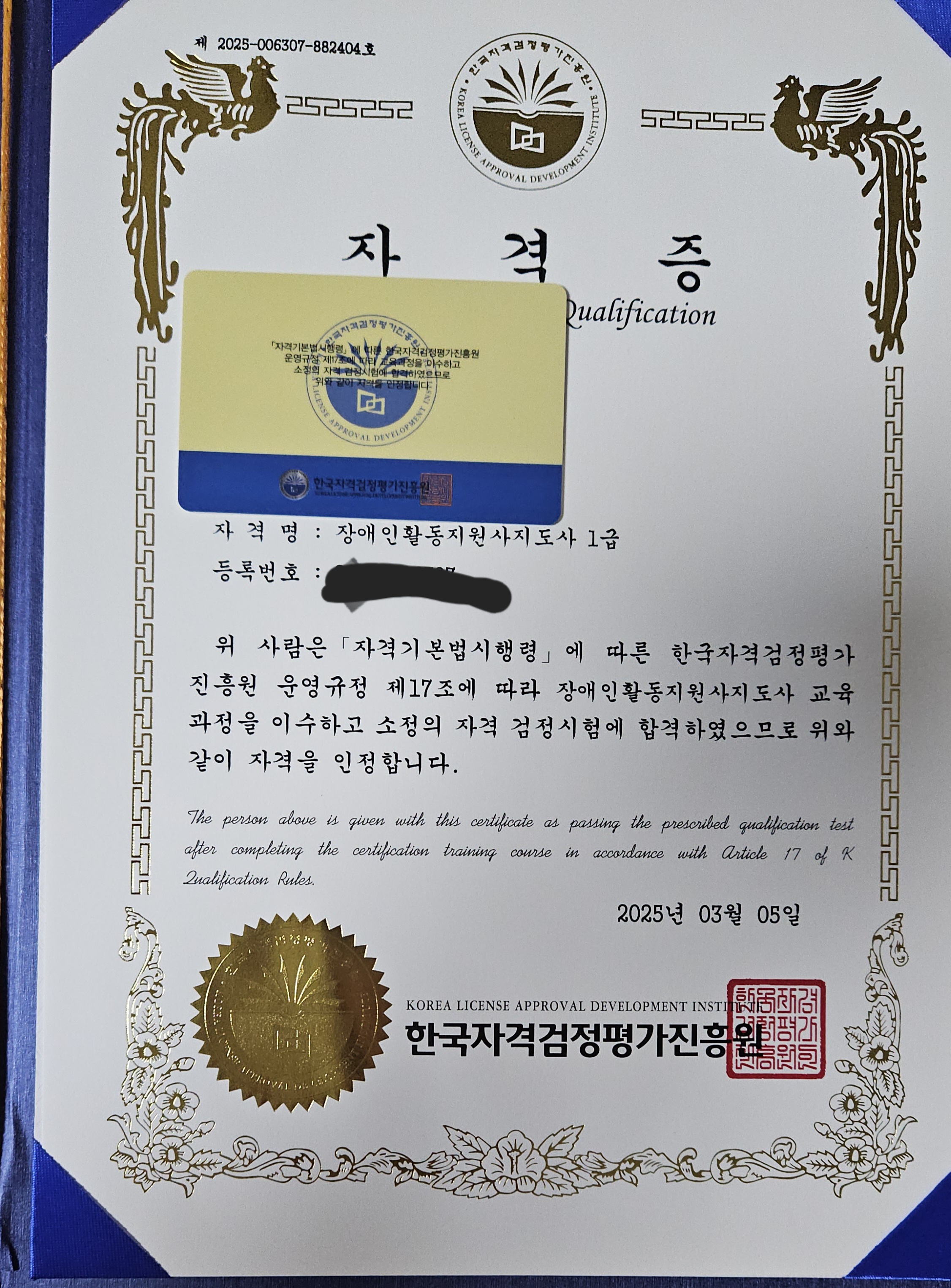 장애인활동지원사 자격증을 취득하였습니다. 여러 종류 자격증에 도전하려 합니다. 모두 화이팅 입니다~^^ 어렵지 않아요~^^ 인터넷으로 자격증을 취득할 수 있다는것에 놀라울 따름입니다. 감사드립니다~^^