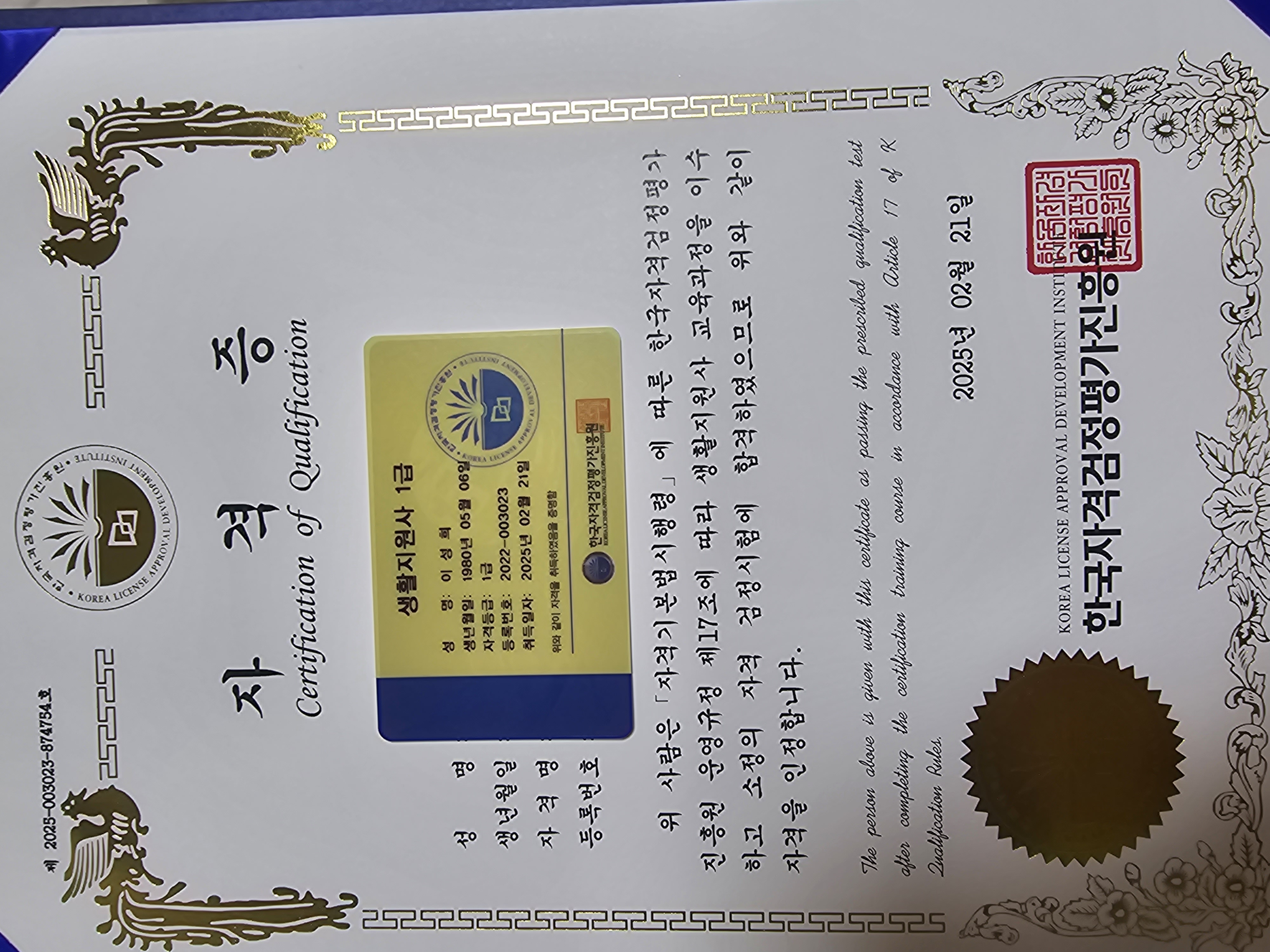 생활지원사 취득하려고 알아보던중 이곳을 알게되어 인터넷 강의를 무료도 듣고 자격증도 취득했어요 집에서 수업 받을수있고 강의 내용도 너무 좋았어요 자격등 취득해서 취업 도전 해보려구요
