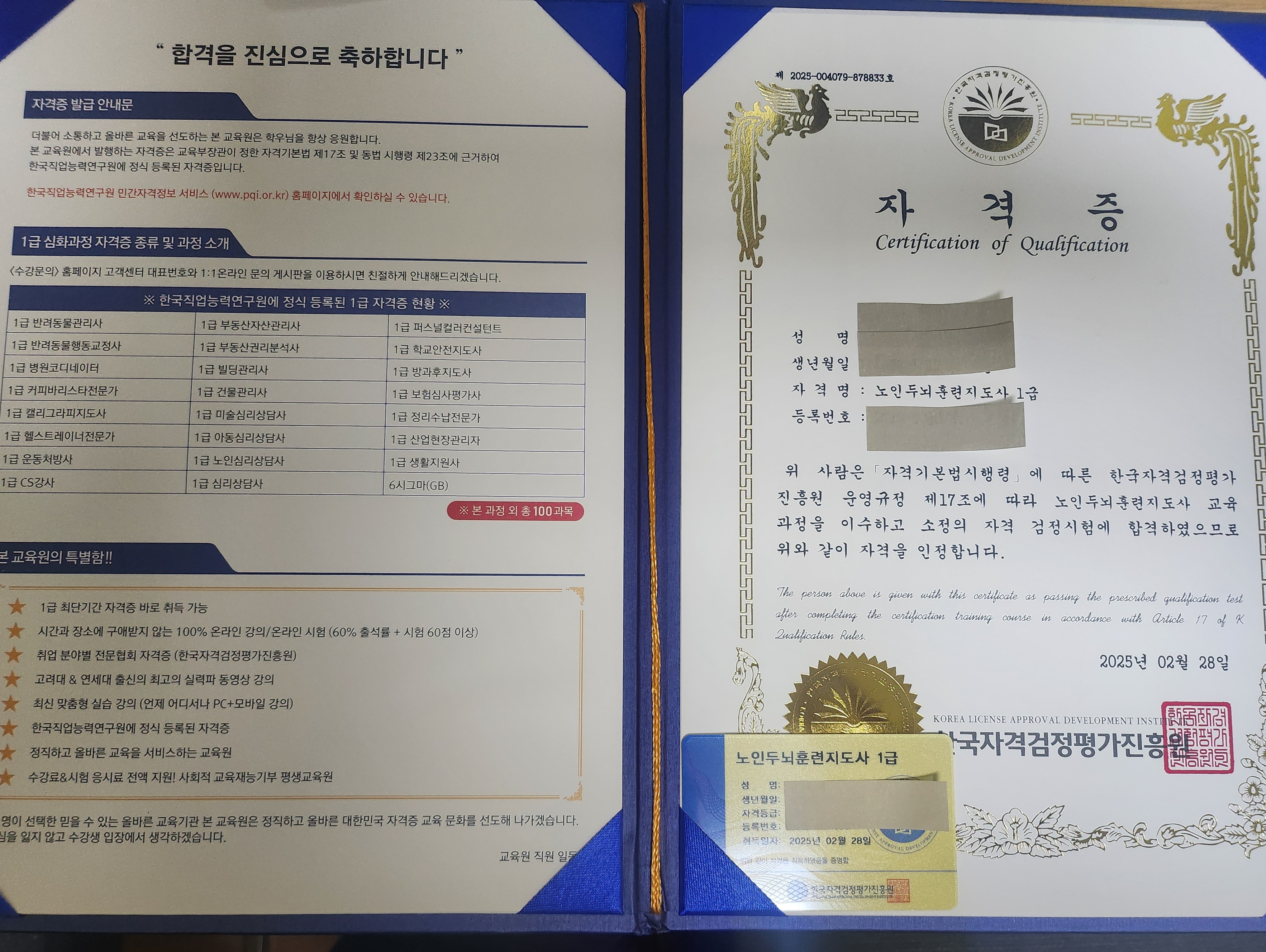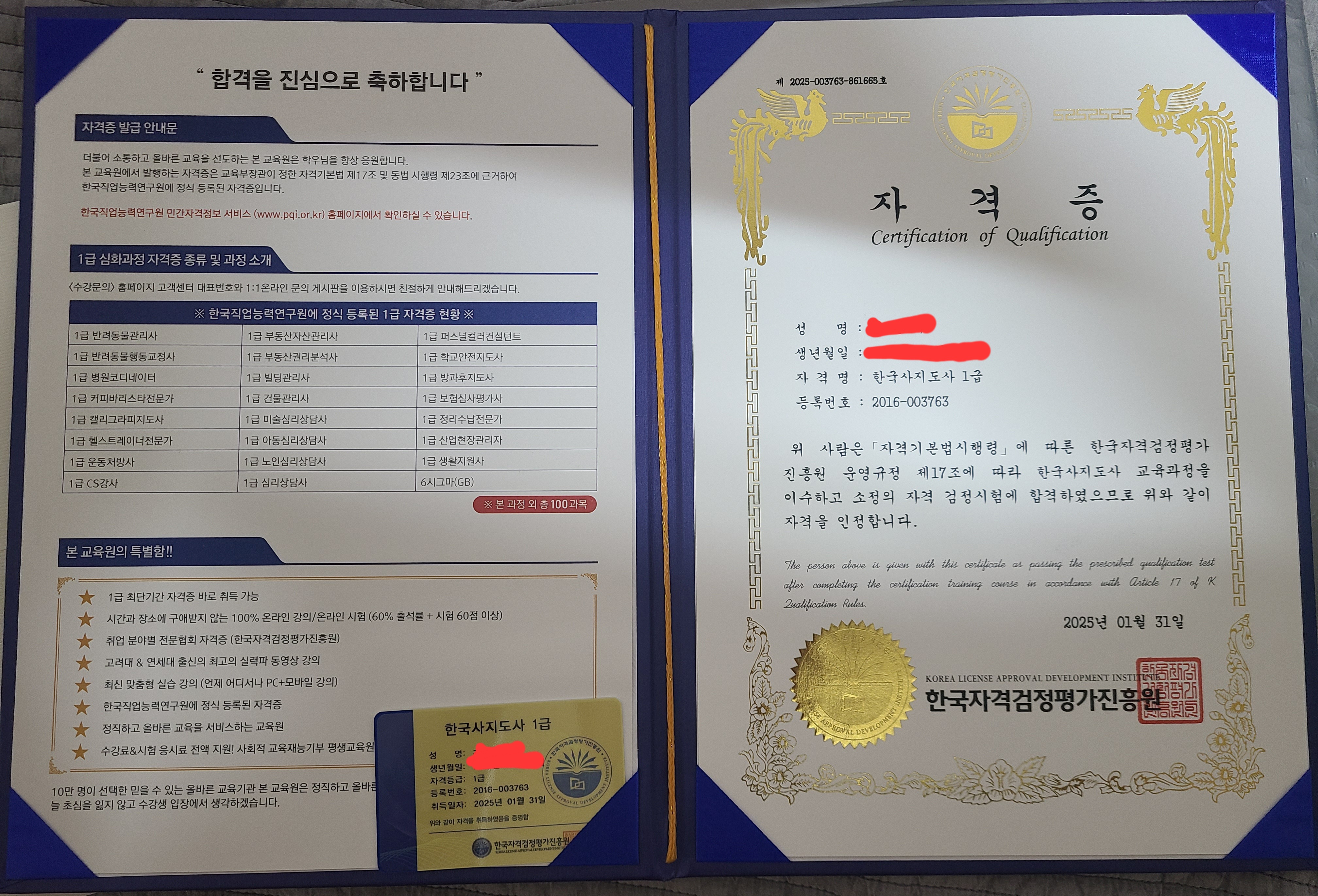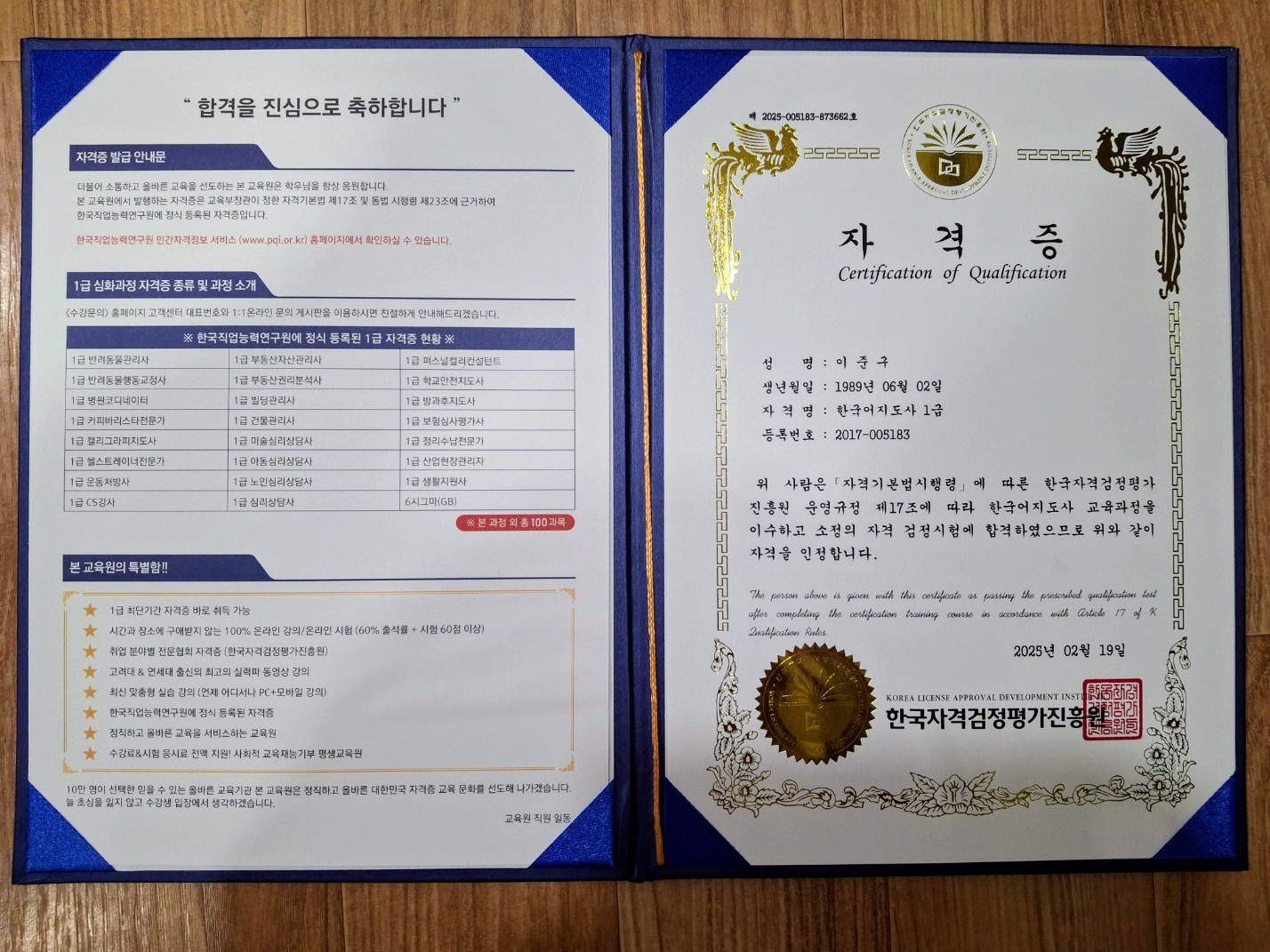 전 이 사이트랑 자격증이 있다는 것을 우연히 알게되었습니다. 아 여기라면 괜찮겠다고 생각하게 되어서 취득하게 되었습니다 분명히 저에게 좋은 일이 생길 거라고 생각합니다. 단 지금 합격후기를 올린 이유는 바빠서 이제 올리게 되었습니다.