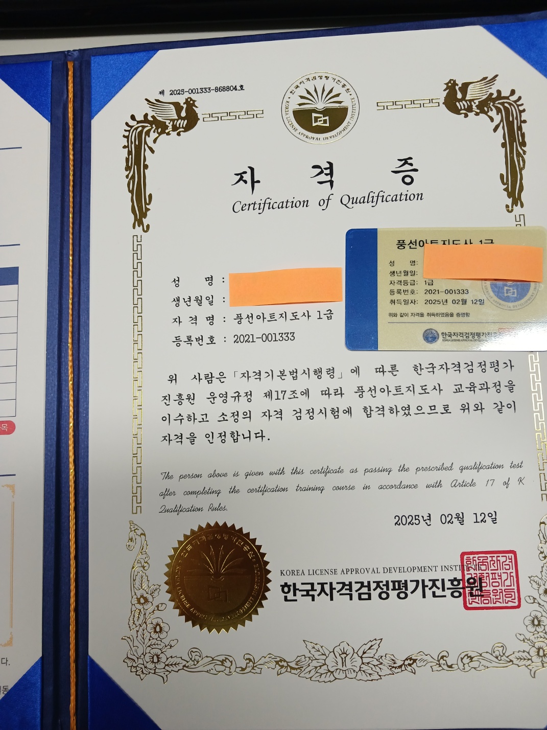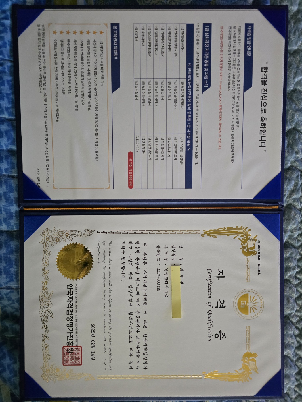 어려서부터 공부랑은 거리가 멀었던 제가 이 나이 먹고 자격증 공부를 한 다는 것 자체가 큰 도전이였어요. 그런데 주위에서도 많이 취득했다는 이야기를 듣고 자신감을 얻어 시작하게 되었죠. 그리고 결국은 제 손에 들어온 자격증을 보며 눈물이 찔끔 나기도 했답니다. 늙어서도 하면 된다는 마음가짐을 가질 수 있게 해준 고마운 한국자격검정평가진흥원입니다.