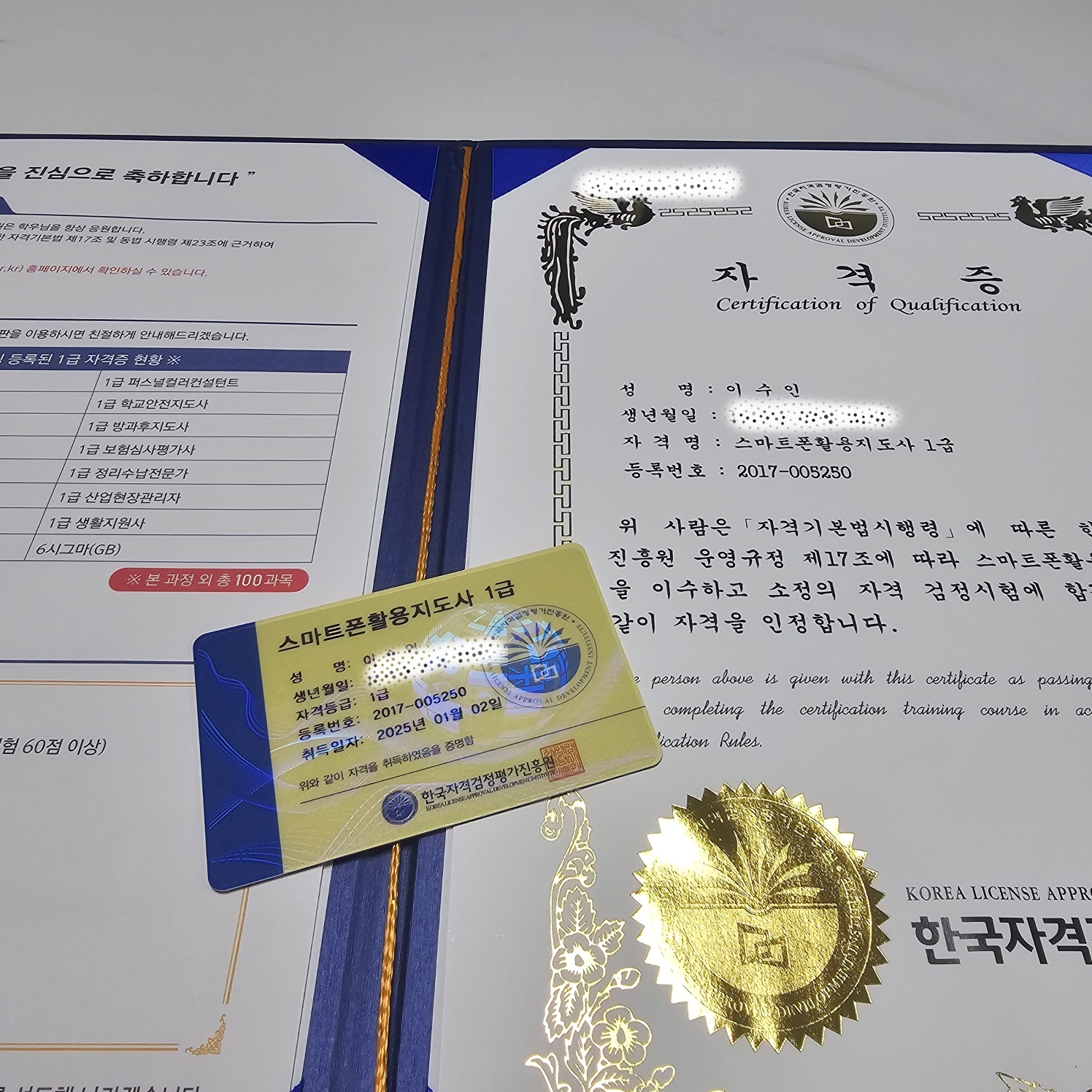 노인분들에게 스마트폰 활용법을 가르치는 일을 하고 있는데, 그동안 받았던 교육과 노하우를 바탕으로 스마트폰활용지도사 자격증을 취득하게 되었어요. 이 과정은 온라인 강의와 실습을 병행하며 이루어졌고, 특히 노인분들이 쉽게 이해할 수 있도록 가르치는 방법에 대한 내용이 많았어요. 수업을 듣다 보니 나 자신도 스마트폰의 다양한 기능을 다시 한 번 정리할 수 있는 시간이 되었고, 더욱 자신감이 생겼어요. 교육 후에는 수업을 진행하며 노인분들이 스마트폰으로 가족과 소통하고, 정보 검색을 하며 즐거워하는 모습을 보니 정말 보람을 느끼고 있어요. 처음에는 어렵다고 말씀하시던 분들도 점점 익숙해지는 모습에 뿌듯함을 느끼고 있어요. 이 자격증을 통해 더 많은 분들에게 스마트폰 활용의 즐거움을 전할 수 있을 것 같아 기대하고 있습니다.
