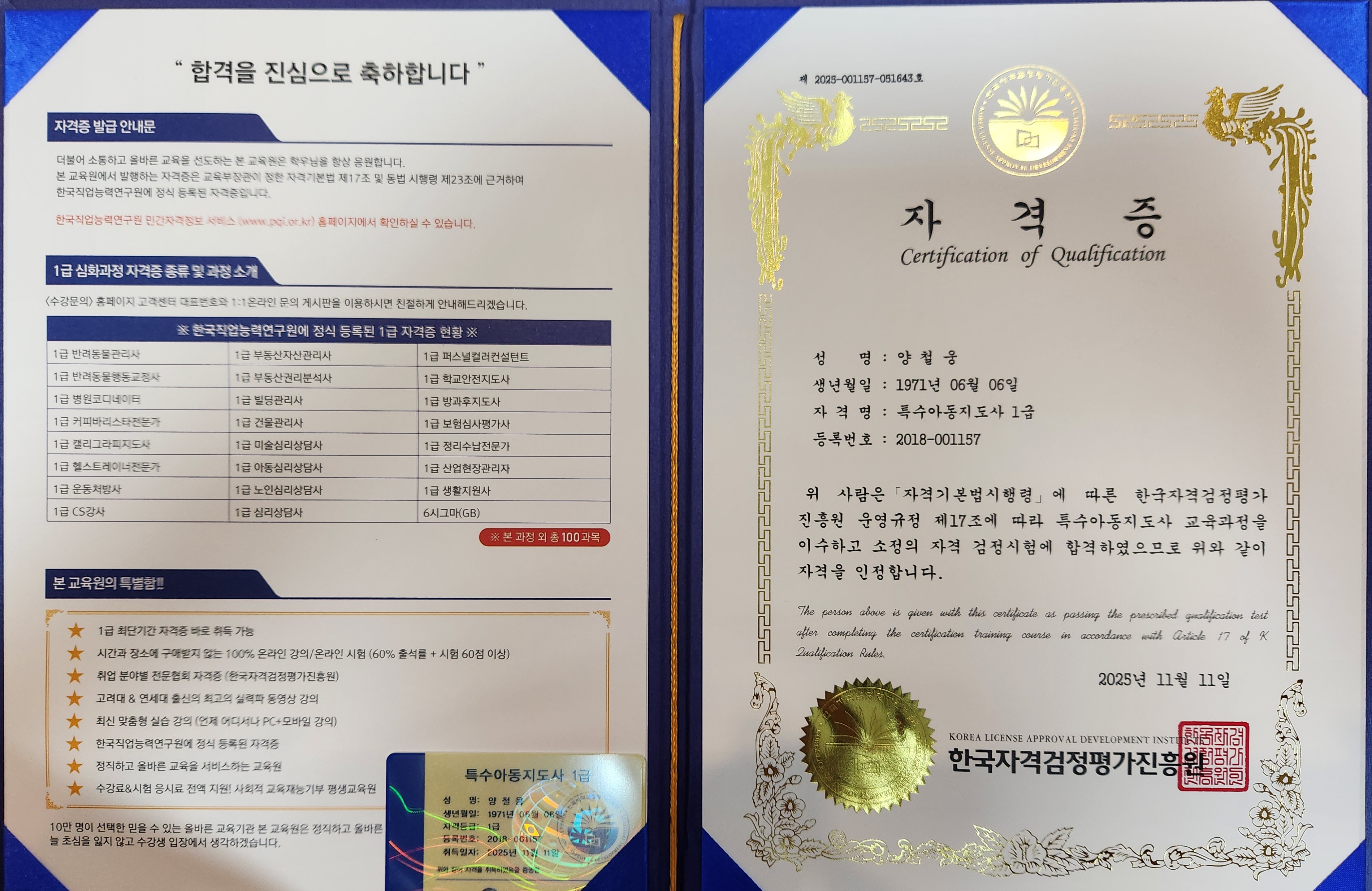 병원동행매니저 1급에 이어 특수아동지도사 1급 자격증을 취득하게 됐어요. 열심으로 강의해 주신 교수님께 너무 감사합니다. 자격증에 걸맞는 지도자가 되도록 노력하겠습니다. 앞으로도 더 많은 다른 분야도 배워보고 싶습니다.