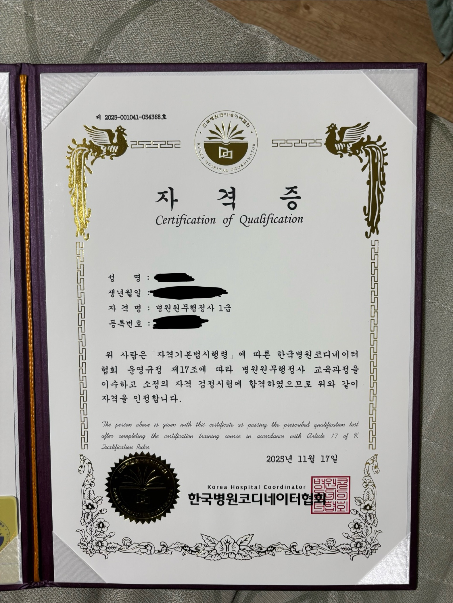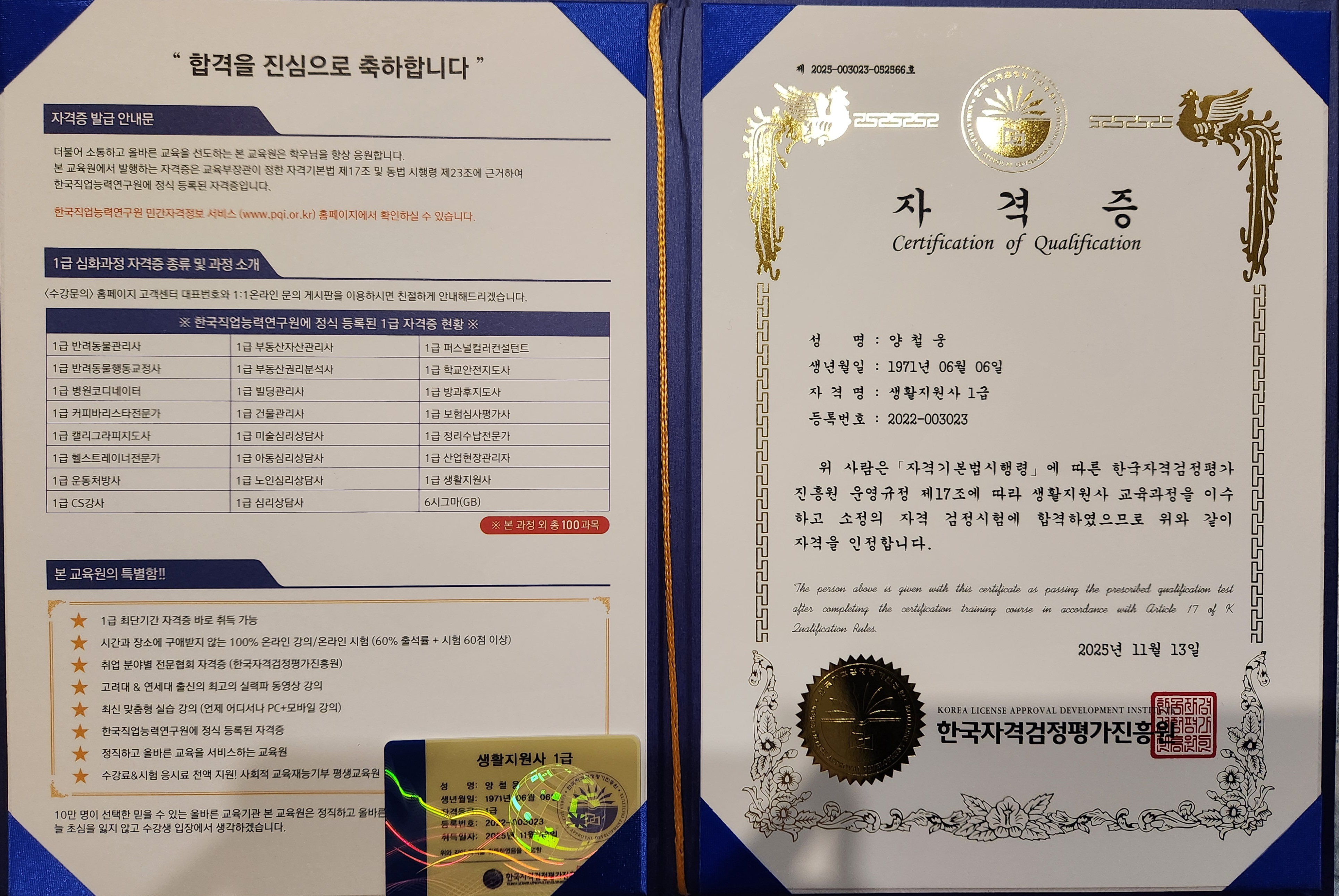 가족 중에 케어 받아야 하는 환자가 있어서 가족 재가 중에 조금 더 전문적으로 케어하고자 싶어서 강의를 듣게 되었습니다. 앞으로 더 유용하게 쓰일 병원 동행 매니저 1급을 취득했고. 많은 공부도 되었습니다. 바쁜 와중에도 틈틈이 강의를 들을 수 있다는 점이 너무 좋았고, 믿음 가는 자격증이라 성취감도 얻었습니다.